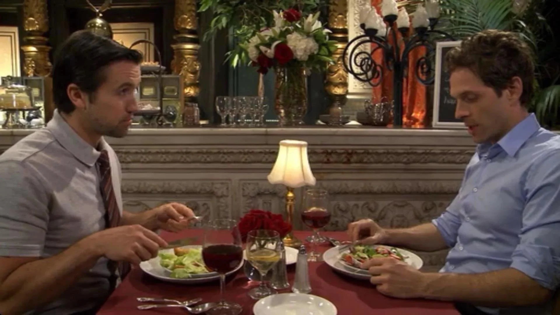Mac McDonald (left) and Dennis Reynolds (right) on their monthly dinner date in season 8, episode 9, The Gang Dines Out.